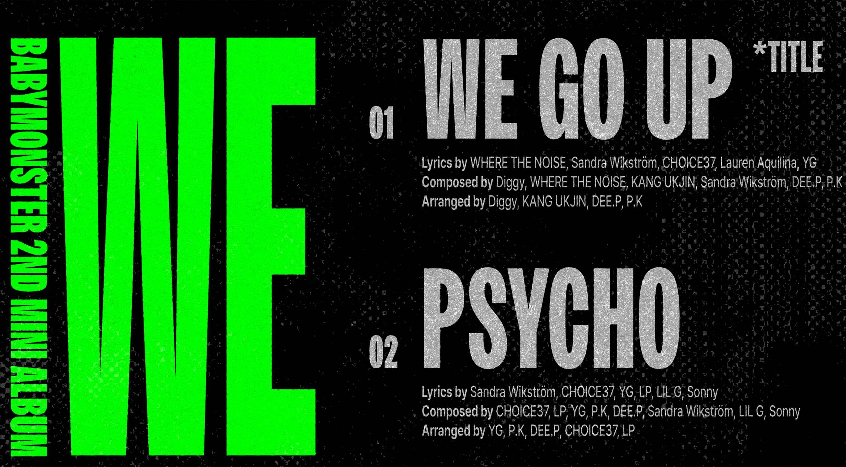 베이비몬스터의 미니 2집 ‘WE GO UP’은 10월 10일 오후 1시 발매된다. 동명의 타이틀곡 ‘WE GO UP’은 강렬한 에너지의 힙합 기반 곡으로, 더 높은 곳으로 비상하겠다는 포부를 담았다. 여기에 타이틀곡 후보였던 ‘PSYCHO’, 힙합 감성을 더한 슬로우곡 ‘SUPA DUPA LUV’, 컨트리 댄스곡 ‘WILD’까지 4개의 신곡이 수록됐다.